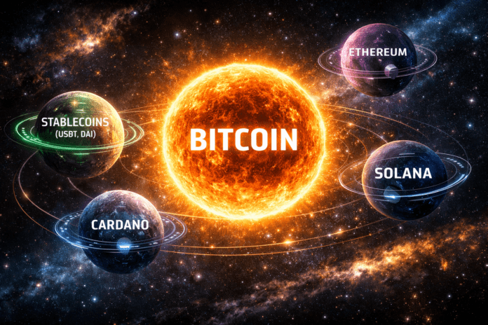 Este punto de origen funciona como una singularidad. A partir de él, se genera un nuevo espacio donde las reglas no son impuestas por instituciones, sino codificadas en software y validadas por consenso distribuido. Bitcoin no es simplemente el primer elemento de este sistema. Es su centro gravitacional. Como el sol en un sistema planetario, concentra seguridad, estabilidad y confianza. Su diseño —basado en prueba de trabajo, descentralización y resistencia a la censura— lo convierte en el ancla sobre la que se construye todo lo demás.